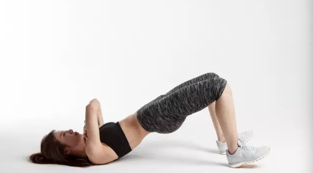 臀桥 3 组,每组力竭 激活臀大肌力量。双手抱在胸前双肩离地,身体正面呈一条直线,提起脚尖,腰部下沉,臀部上提,感受臀部收紧。