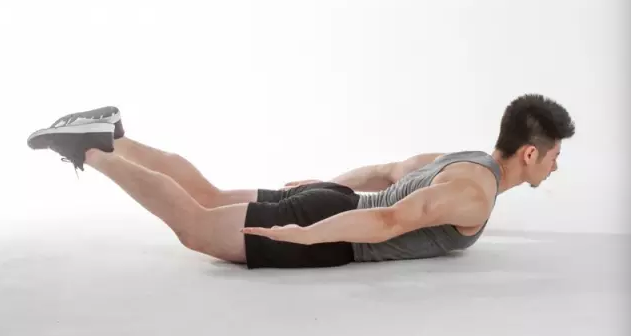 并腿小燕飞 3 组,每组 20 秒 脚跟并拢,用力夹紧,膝盖和胸部离地,用力收紧大腿后侧、臀部、背部肌肉。