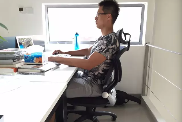 这种姿势会让腹肌完全松懈,压力全压在后腰的腰方肌上,而且颈部一直是向前弯曲的状态,也会加剧骨盆前倾。 正确坐姿
