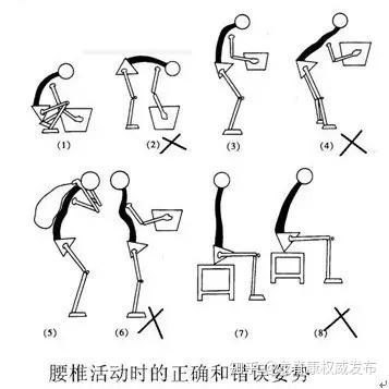 如上图,这些人群最容易出现腰椎间盘突出。 同时:坐姿不正,腹压增大,突然负重、妊娠、受寒和受潮等,都是导致椎间盘内压增大,诱发腰突症的常见因素。 二、预防腰椎间盘突出从正确姿势开始