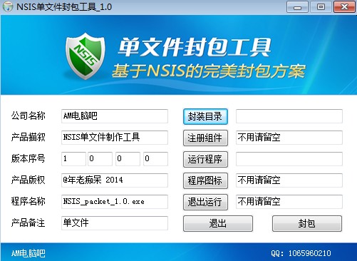 NSIS单文件封包工具是一个绿色单文件软件封装工具,界面友好,傻瓜式操作,在封包时,可选自定义封包后的程序版本号、文件信息、以及自定义图标等. 本工具基于NSIS压缩模块,LZMA算法高压缩,打包后的文件禁止解包,同时支持子目录的打包. 打包时支持注册dll.exe.reg导入,打包后的单文件程序静默运行释放到临时文件夹运行,关闭程序反注册(reg例外),并删除产生的临时文件 |