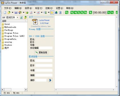 歌词力量Lyrics Power是一个界面漂亮、功能多多的LRC歌词编辑工具。 主要特色: (1)华丽的 Office XP界面,非常漂亮。 (2)多种排序功能,让编歌词更方便、更快捷,而其中的压缩排序,能使 LRC 文件更加小巧玲珑。 (3)多种删除功能,使你能随心所欲地删除时间标签,而其中的删除多余信息的功能,能让你只按一个按钮,就能把网站的广告语句统统删除。 (4)插入预设信息功能,方便 LRC 网站插入广告语句。 (5)导出 SMI功能,让 Windows Media Player 也可播放歌词。 (6)多种批量处理功能,让你能更快地对 LRC 文件进行诸如压缩排序、删除多余信息、导出 SMI 的操作。 (7)诸多方便使用者的功能,在此也不再多讲,而每项功能都是力求使你能更方便地编写LRC 歌词。 |