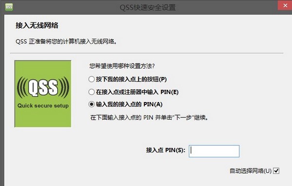 QSS快速安全设置是一个指导您完成无线网络配置的工具,本程序使用Qss来配置您的无线网络。 pin码连接工具,完美支持win7系统,WIN7下使用的QSS,亲测可用 只要我们记住了pin码,随便怎么改密码,都可以破解。这时候我们就用到上面的QSS软件了。 打开QSS连接软件,下一步: 在框中输入破解得到的pin码。点击下一步,软件会自动寻找路由,自动连接啦。 |