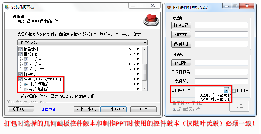 3.如果PPT里使用了几何画板控件,打包时选择的控件版本必须和安装几何画板时选择的控件版本一致
