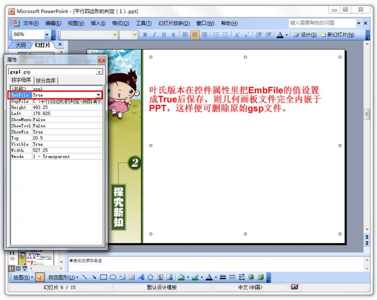 4.必须在控件属性里设置EmbFlie的值为True然后保存PPT,即几何画板文件内嵌于PPT,之后可以删除原始gsp文件。  特别提醒 本软件由脚本语言编写,部分“安全”相关软件可能误报,疑者勿用。 如果打包遇到问题,请退出这些“安全”相关软件后重新打包试试。 附权威扫描报告:http://r.virscan.org/report/b5f531e37bc87adaa922068bb91d96ac.html |