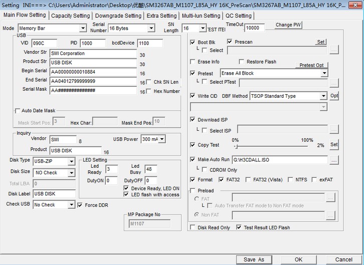 设备制造商: SMI 设备型号 : USB DISK 当前协议 : USB2.0(连接到USB3端口可以获得更高性能) 输入电流 : 300mA 分区系统 : CDFS 是否激活 : 是 是否对齐 : 56 KB 已扇区对齐 芯片制造商: 慧荣(SMI) 芯片型号 : SM3267AB S 闪存颗粒 : 美光(Micron) U盘得分 : 34 分 (参考分值 >= 30 ,分值越大性能越好!) 固件版本 : ISP 131106-1AB
