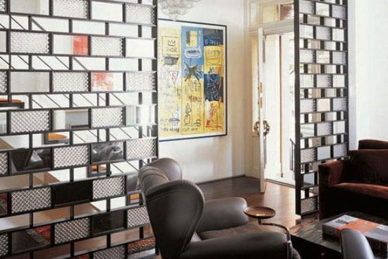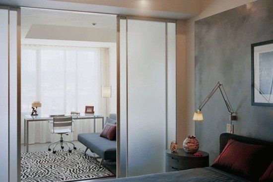 玻璃也是一种常见隔断,玻璃品种繁多,有普通玻璃、磨砂玻璃、彩绘玻璃等,而且通透性与装饰效果突出,在光的作用下色彩有变化,且价格适中,所以在隔断中运用非常普遍。其中用玻璃门作为卧室和卫浴间的隔断,可以避免木门或铁门带来的沉重感,显得更为轻巧,装饰性也更强,磨砂的玻璃也不至于让你在洗澡的时候“春光外泄”。