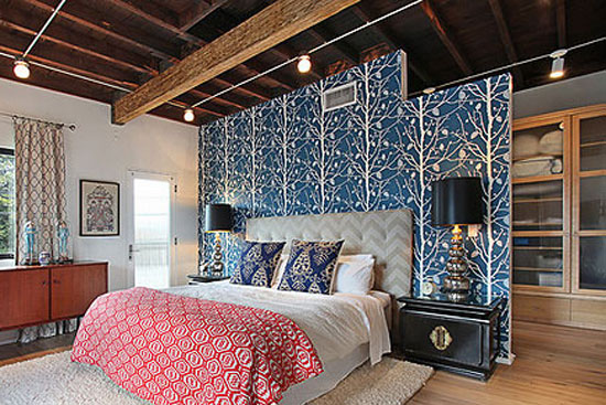 在卧室内设一立板,上面绘制一些装饰图案,安装在床头的位置,木板制成的床头背景墙将室内分别划分为卧室和小书房。