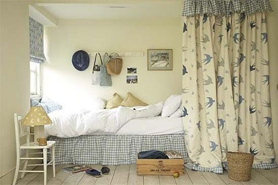 作为一种软隔断,色泽漂亮的布帘将卧室分割成几个不同机能的小空间。如需要,布帘隔断就可以任意开启,是弹性隔开卧室睡眠空间和公共空间的理想形式。