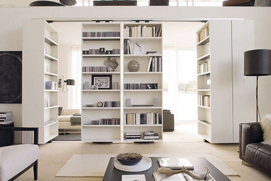 利用书架隔开卧室和书房,不仅避免了因隔断的存在而浪费额外的空间,反而方便了一些书虫的需要。书架两侧的放满书,无论是坐在书桌前还是床上,书籍都是触手可及。