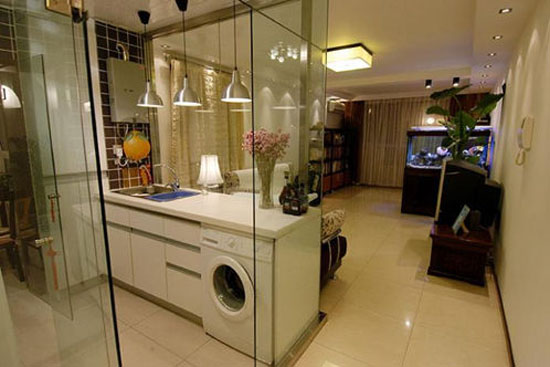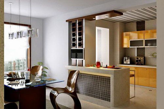 有些开放式厨房也与客厅相连,在厨房外侧做一个造型简单大方的吧台隔断,或者放置一个酒柜,也不失为一种经济实用的设计。吧台或酒柜作为客厅和厨房、厨房和餐厅的隔断,效果十分显著。