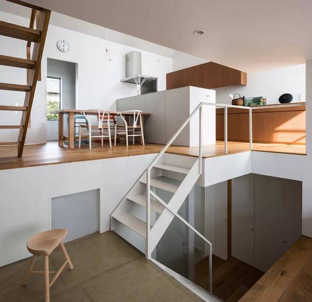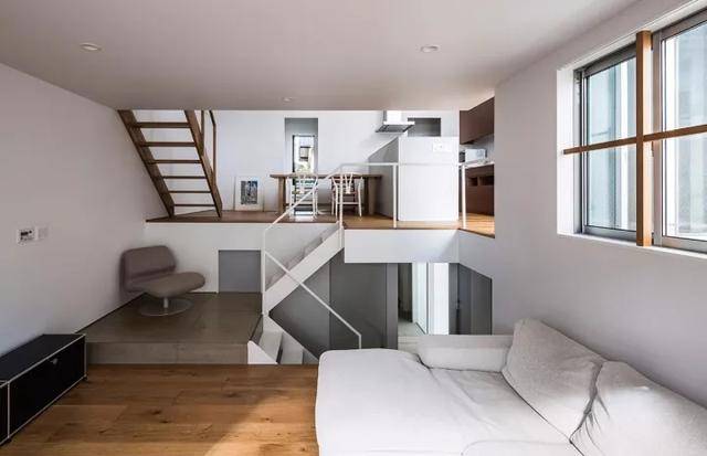 其实这套日本的房子主要是采用了错层设计,原本房子只有两层楼,现在业主利用错层设计将房子分成了4个层次,这样既不会影响室内的层高,又扩大了室内空间,“教科书式”的设计估计连开发商都没想到。