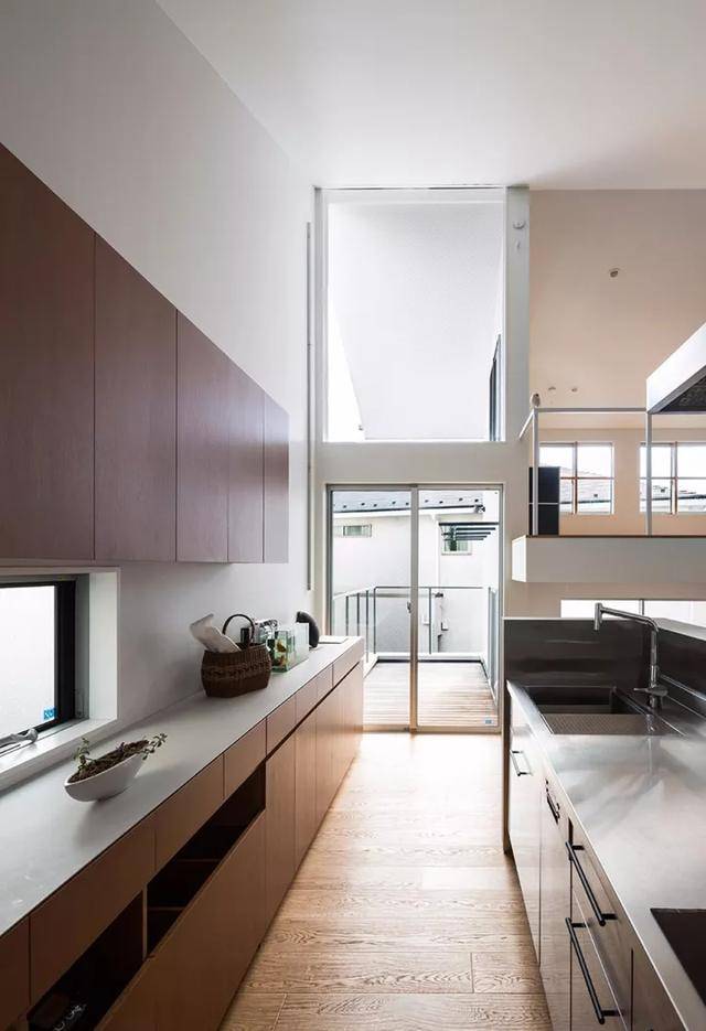 再上去就是厨房和餐厅了,开放式的二字型厨房里,整排的橱柜设计解决了做饭厨具的储存问题,灶台前面还特地抬高了20公分,下面既能收纳,又能遮住杂乱的台面,这种设计在日本是很流行的。