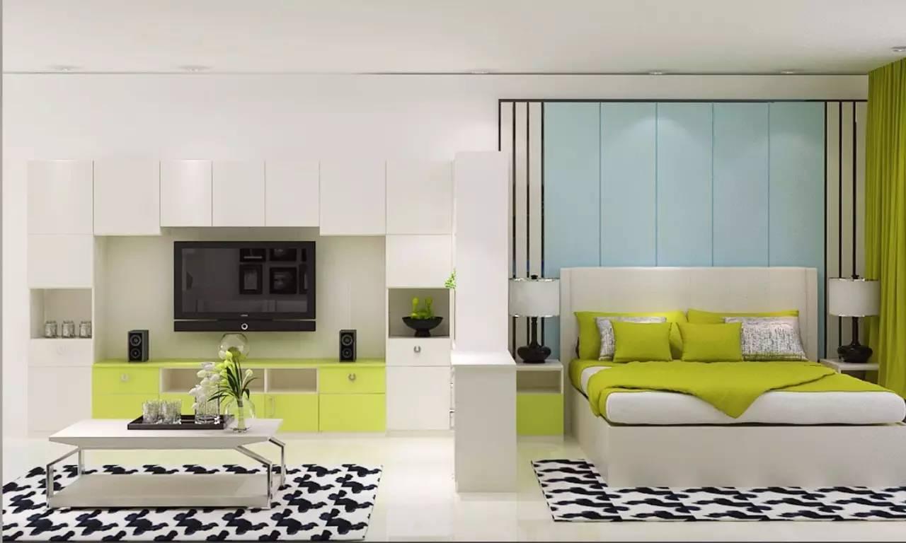 ▲ 单身公寓空间有限,电视柜和空间隔断柜的L型组合满足了大部分收纳需求。
