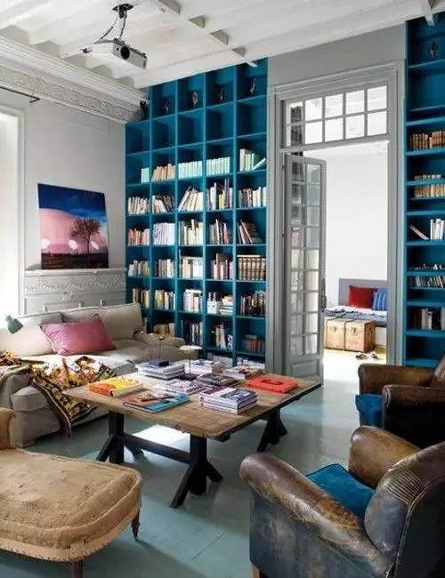 (图片来源于网络) ▲ 两面I型书柜,跟家居跳色的蓝色一致,太有风格了!