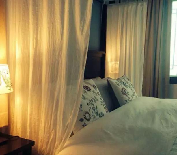 最可爱的就是飞鱼的房间, 榻榻米清爽、四柱床风情,最无敌的是湖景房,地中海风格,工艺的藤条灯,非常浪漫。