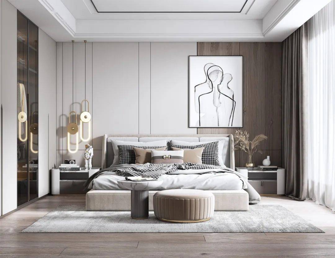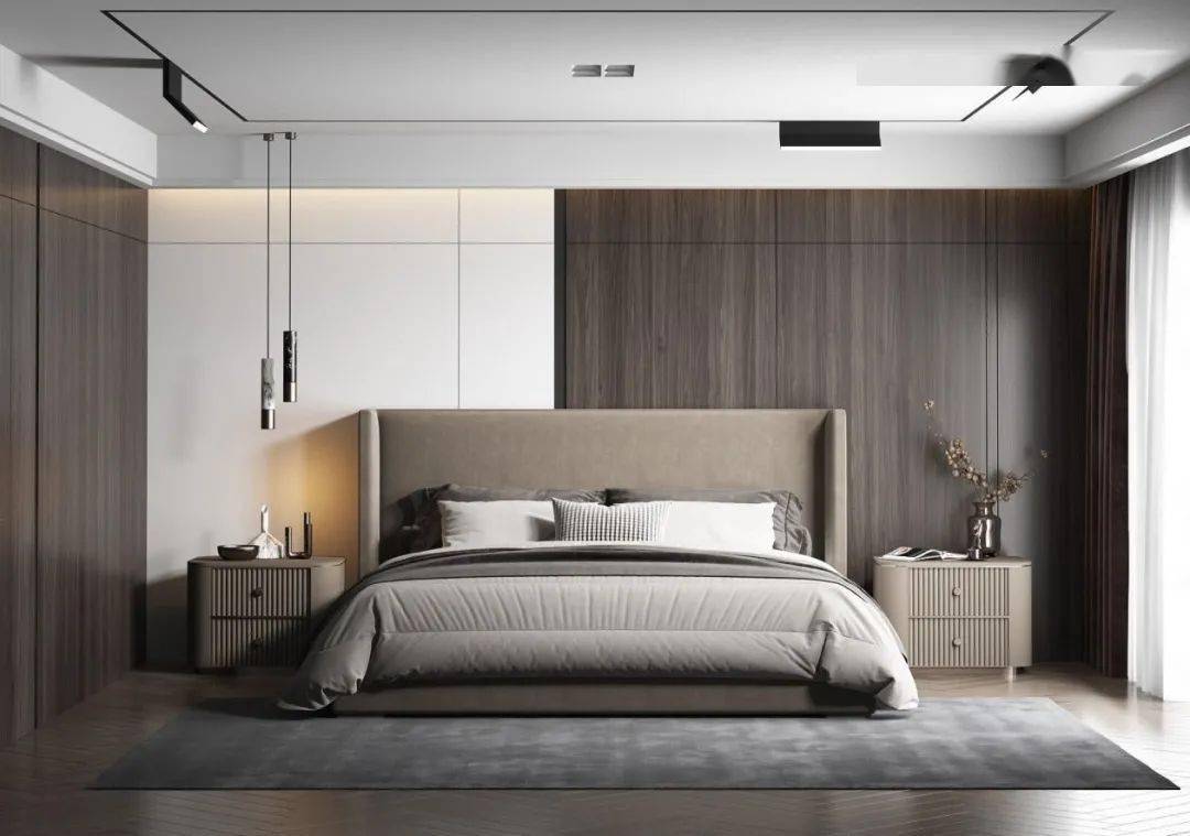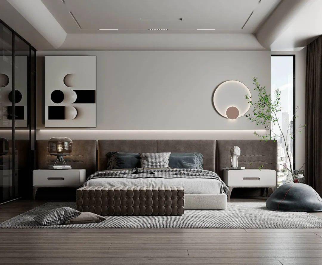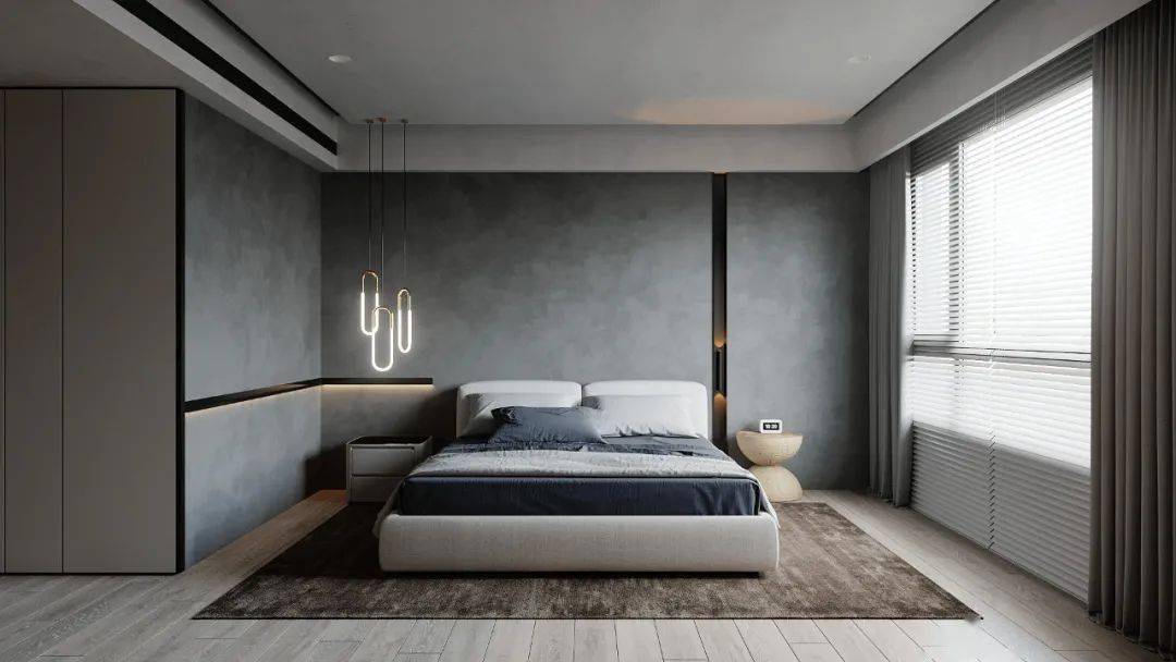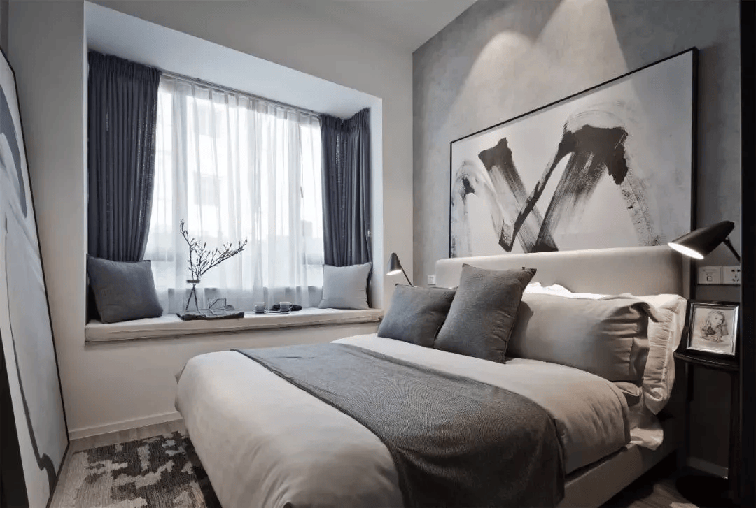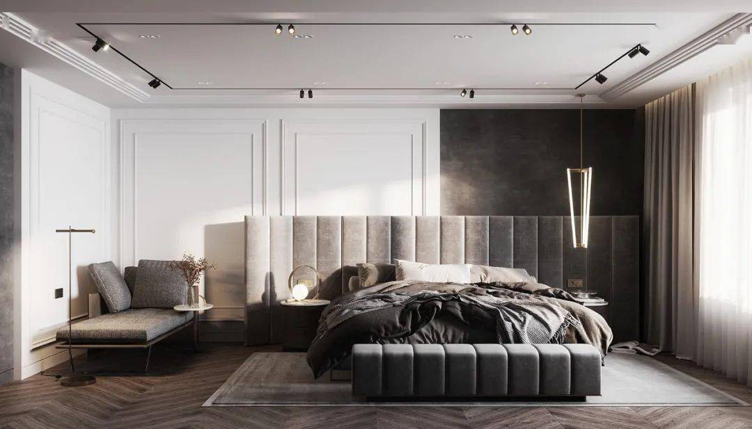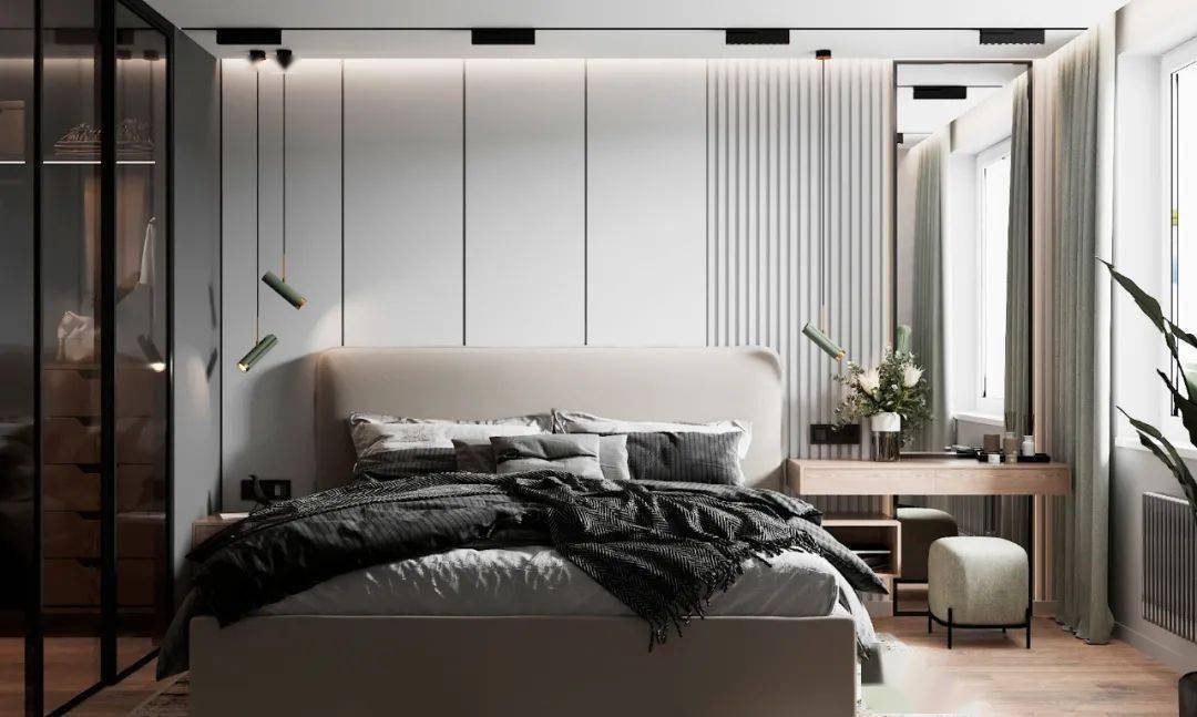 高级灰的设计元素在现代风卧室中尤为适用,以灰色和白色为主基调的卧室空间,再点缀以黑色家具,不仅营造出轻松舒适的氛围,更增添了一抹低调的奢华感。