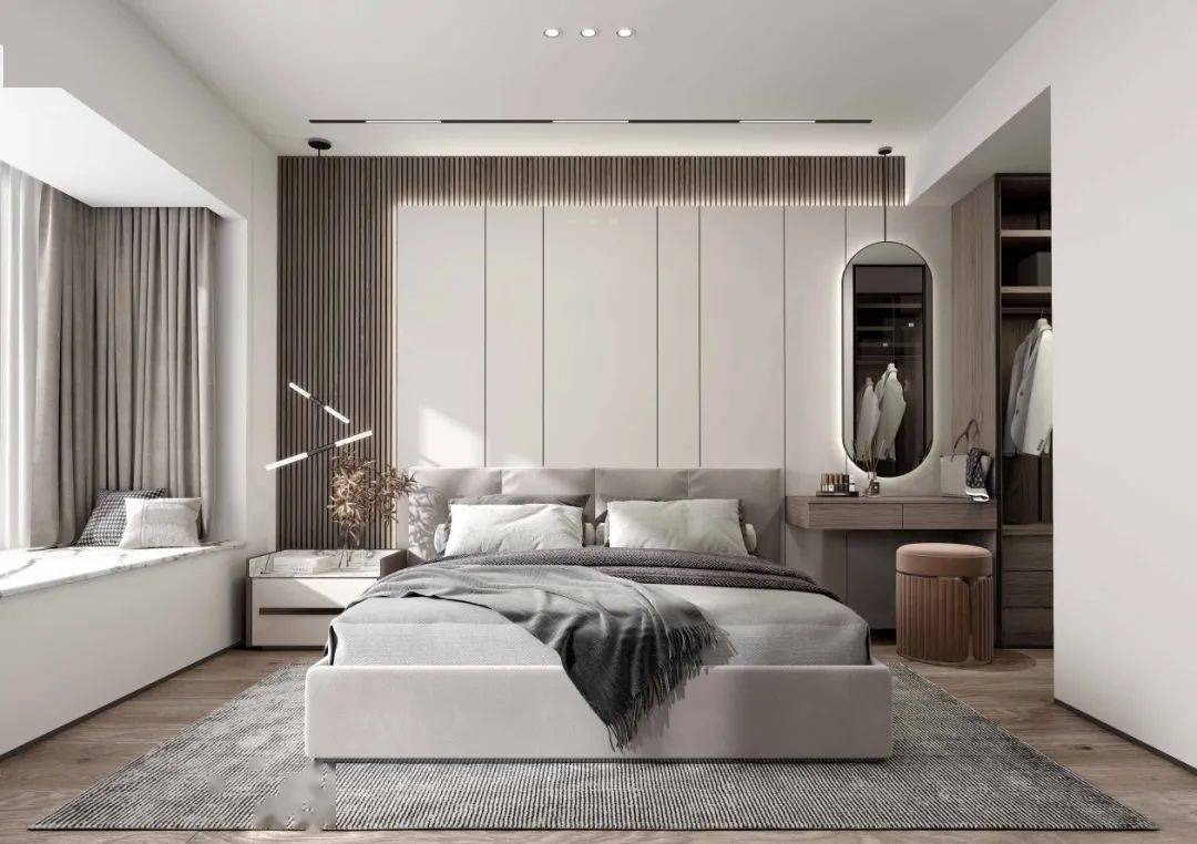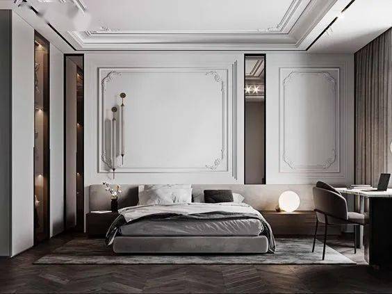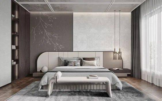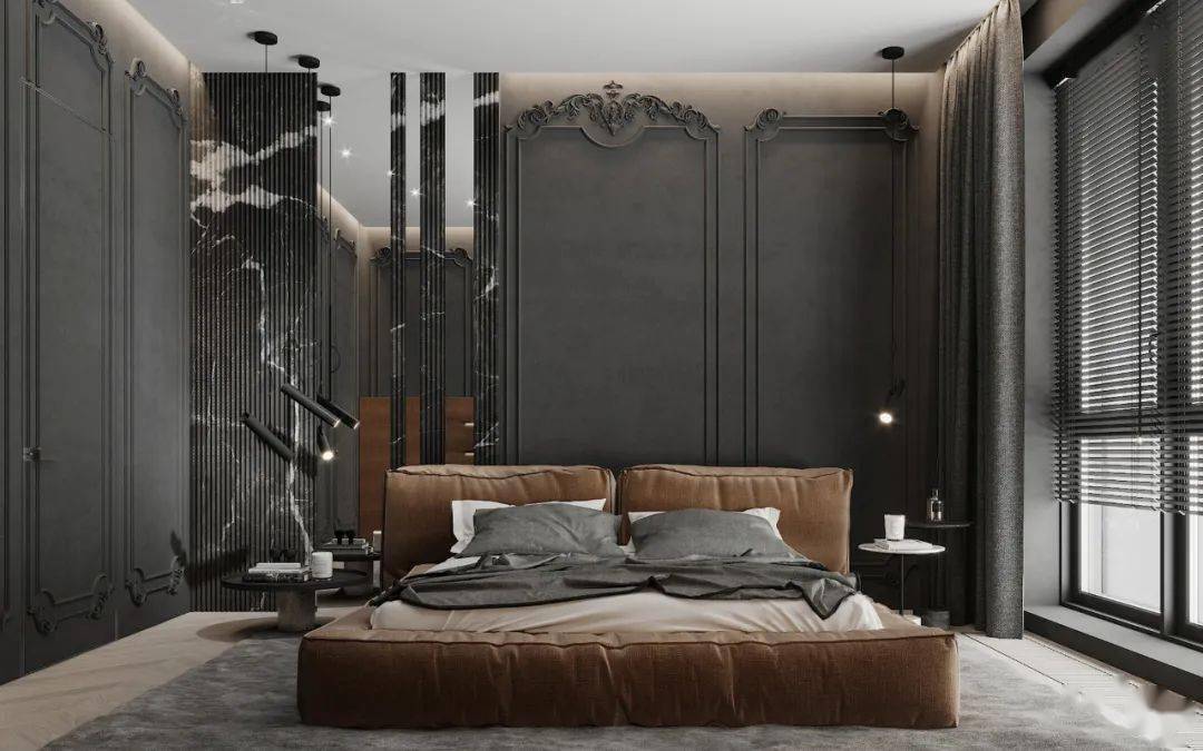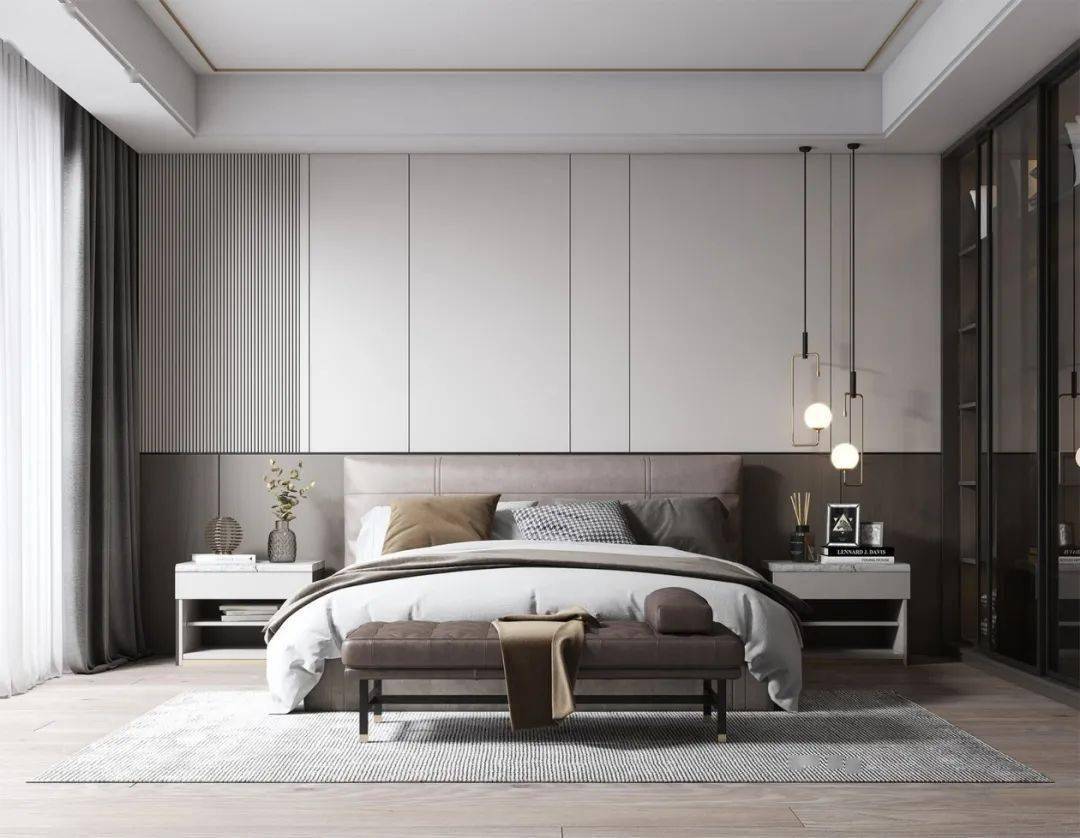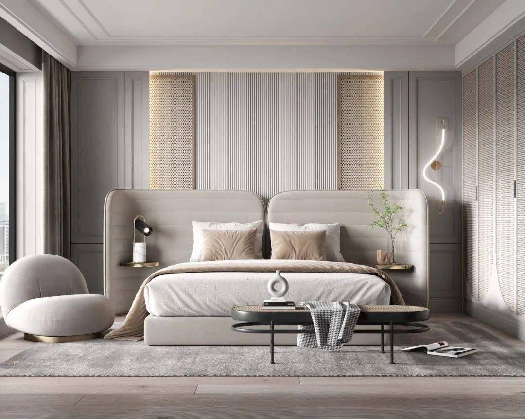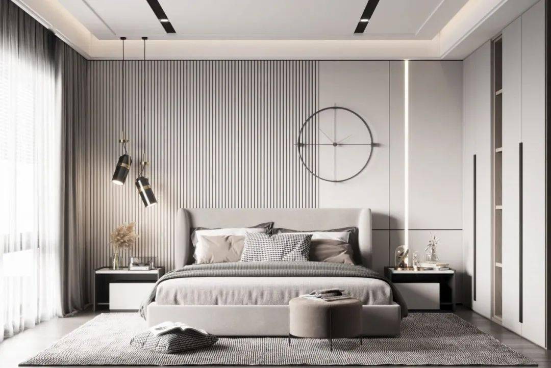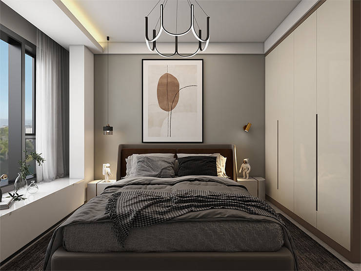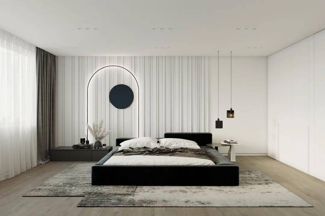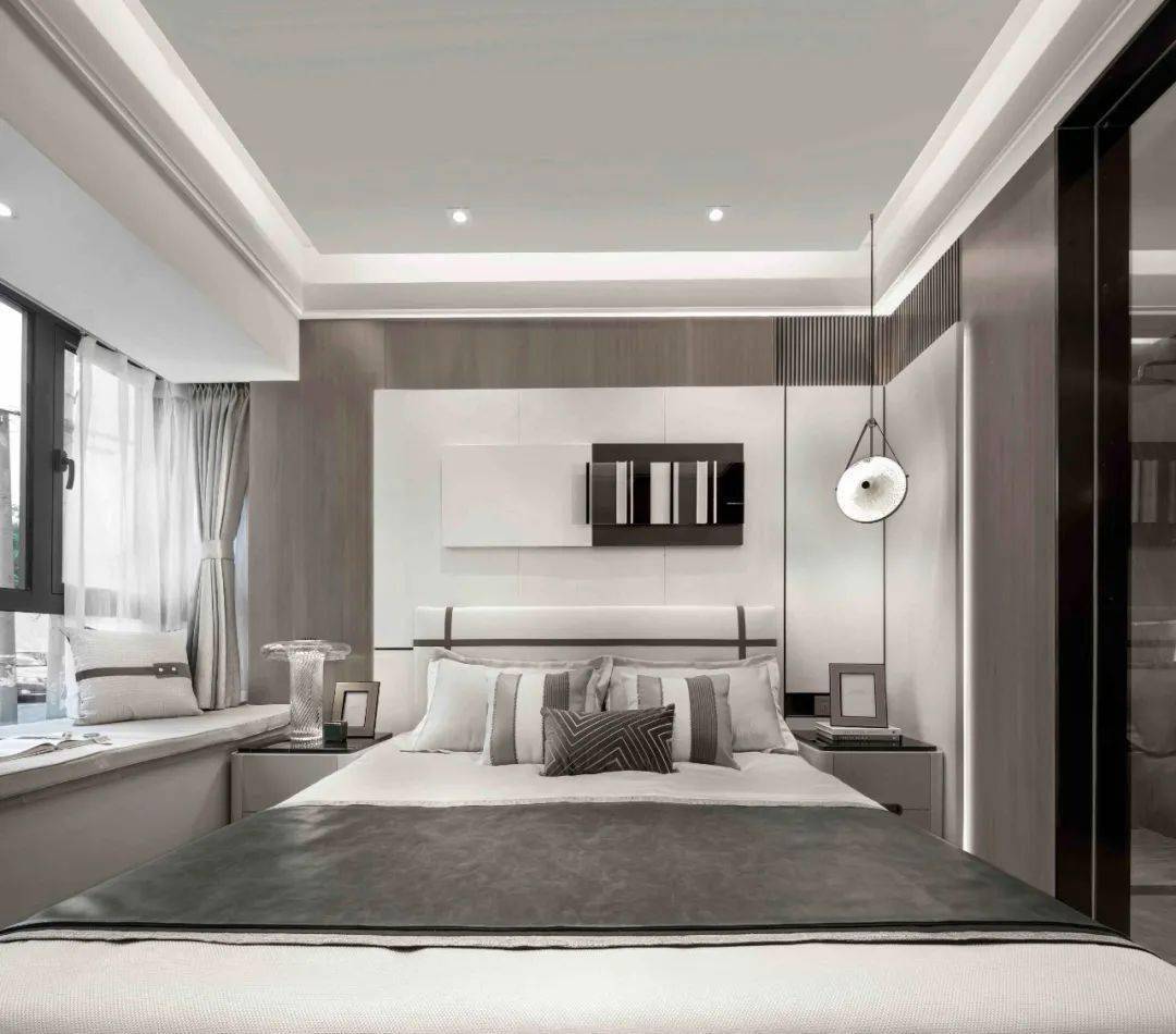 高级灰的设计元素在现代风卧室中尤为适用,以灰色和白色为主基调的卧室空间,再点缀以黑色家具,不仅营造出轻松舒适的氛围,更增添了一抹低调的奢华感。
