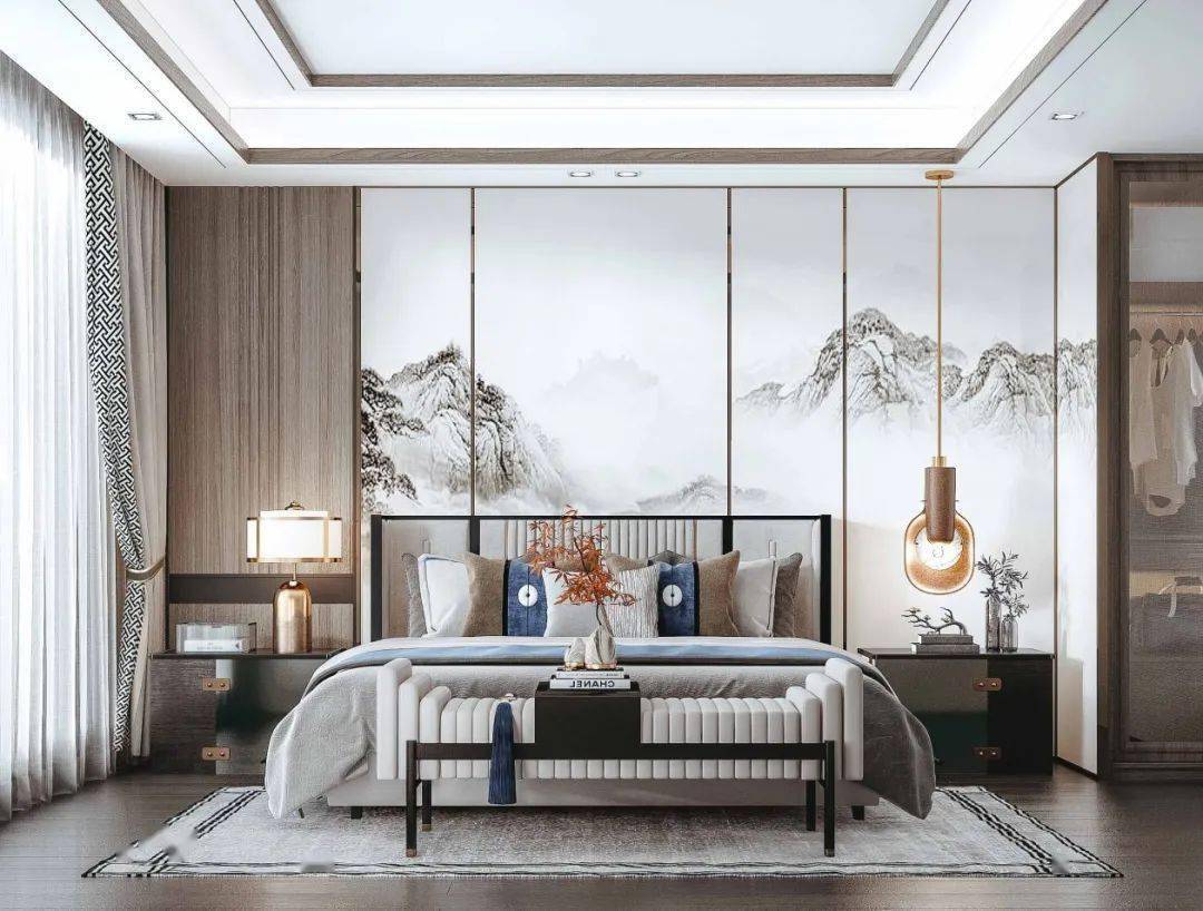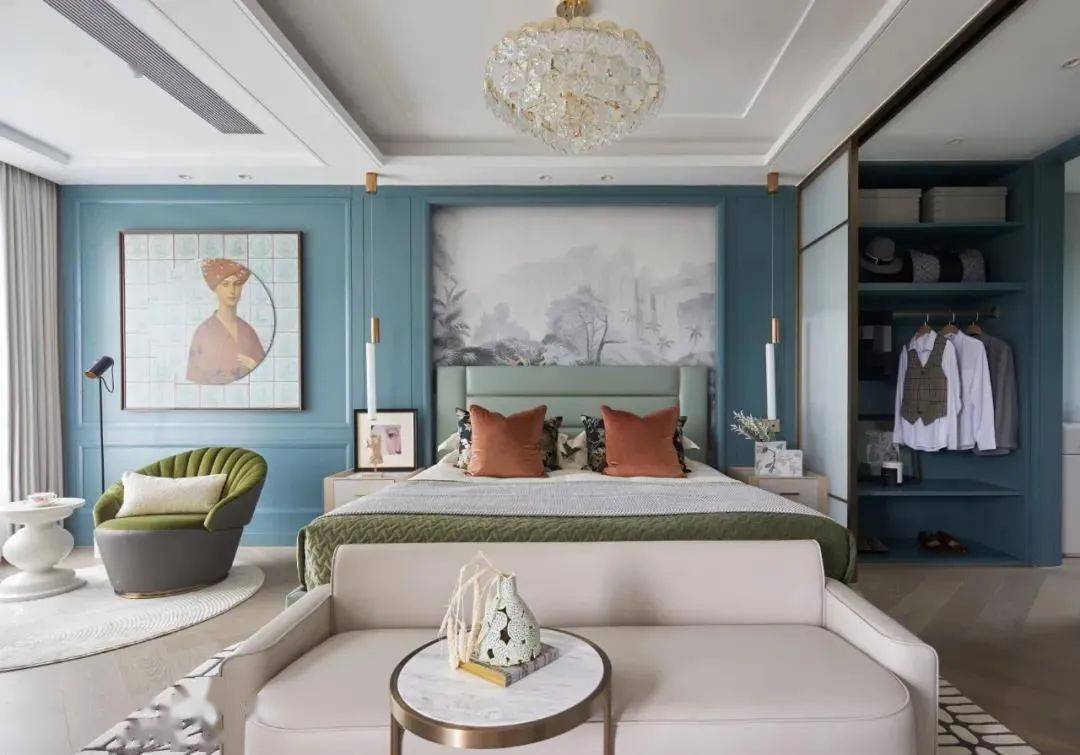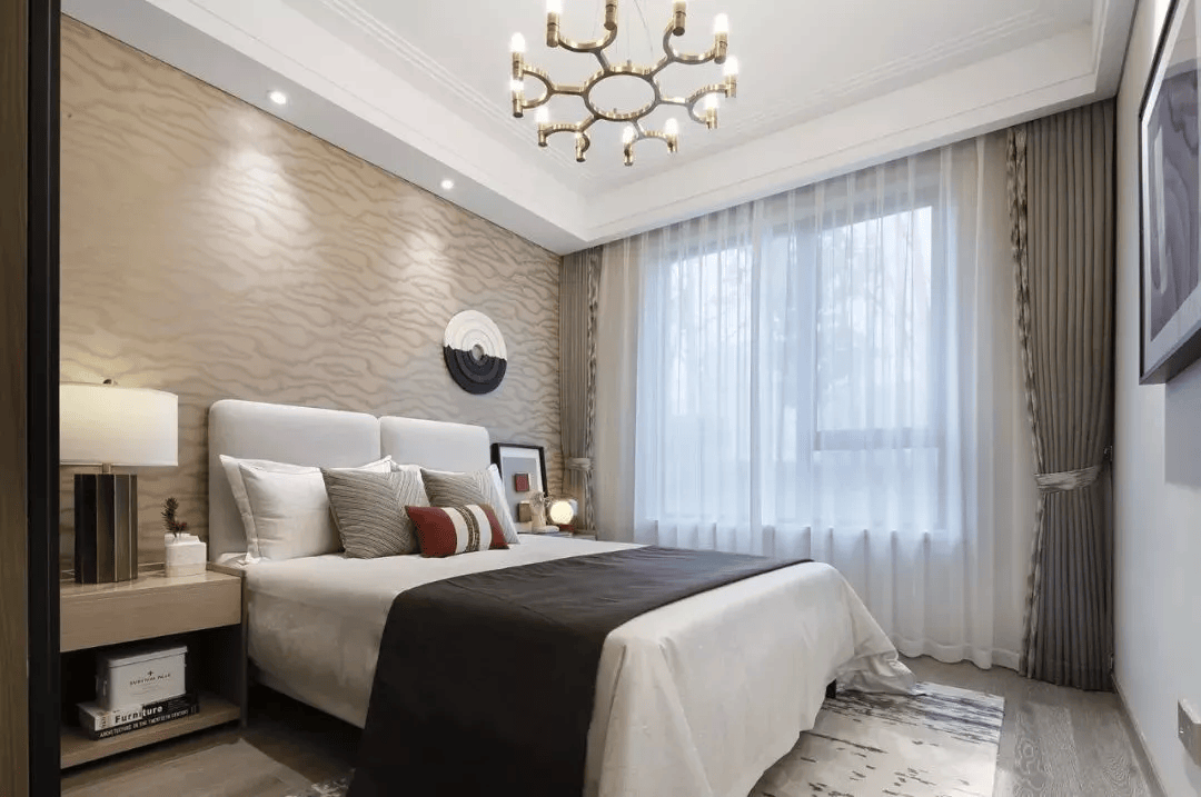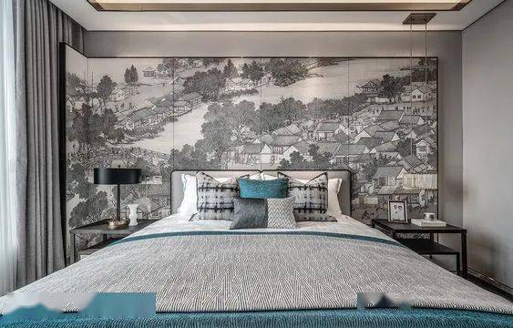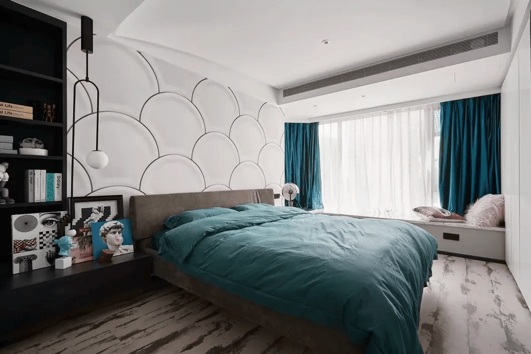 床头壁纸的选择可以大胆尝试创意款式,如几何图形,这样的设计能有效延伸卧室空间的视觉感,让空间显得更为开阔。搭配孔雀蓝的窗帘和床品,更增添了一抹精致与优雅,让卧室焕发出别样的魅力。