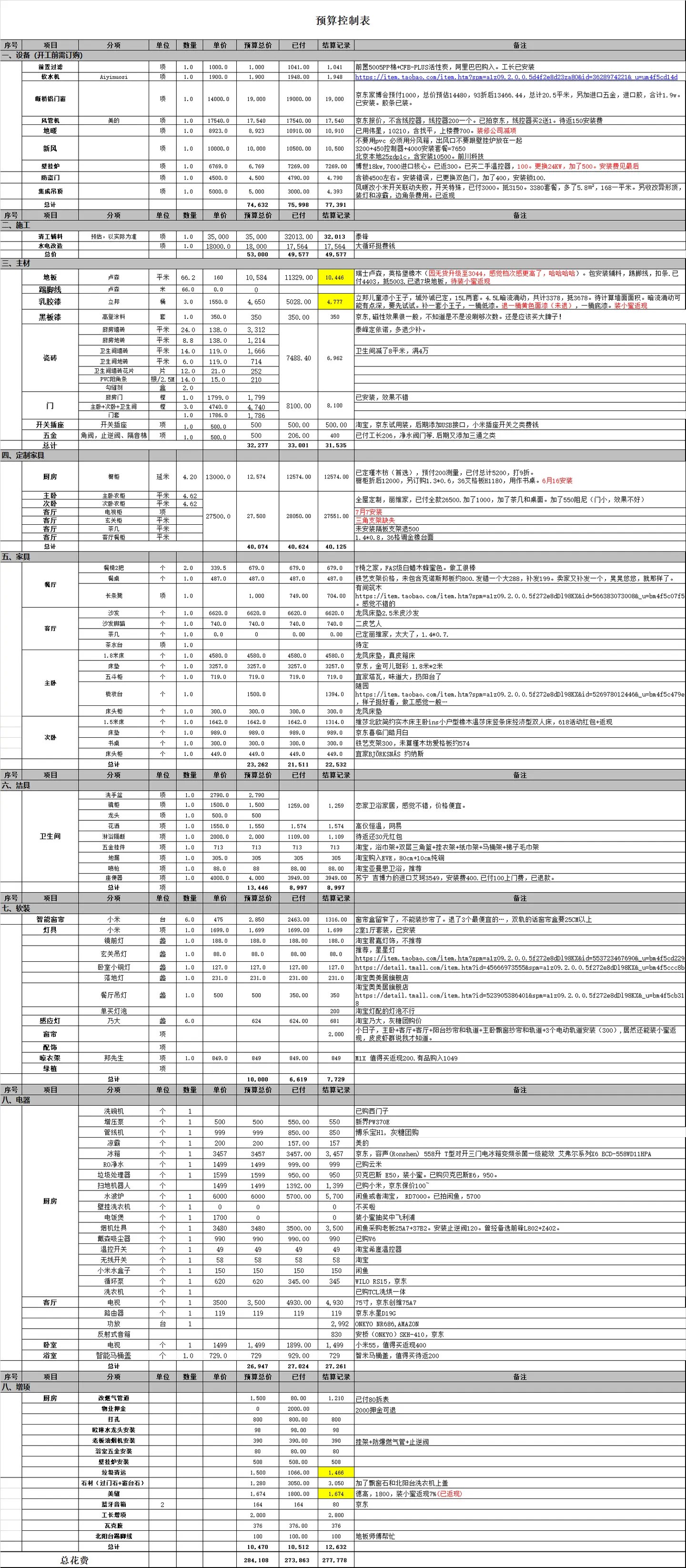 五、装修和哪些人打交道,他们主要是干啥的? 1、战略联盟&撕逼队友:你的另一半、父母、孩子。要尽快达成装修的统一战线,要么引领他们,要么为心爱的人妥协。不要开工了再去吵架,很多年轻的盆友装修还没结束,离婚证已经领了。 2、装修设计师:要不要单独请装修设计师也是个很高频的装修问题,这个角色既重要,但是水货和坑货又挺多,后面重点详细聊。 3、项目经理:装修公司代表,帮你把控整个装修流程。 4、第三方质检员:是装修平台或第三方监理公司专门检查装修质量的工作人员,主要作用是帮业主发现装修中的质量问题。 5、装修公司质检员:是装修公司自家的人员,主要作用是让业主签字,然后催款。 6、工头/工长:工地的大拿,负责你工地的施工协调,有时候和项目经理是一个人 7、水电工:专门做水电的工人 8、瓦工:主要是水泥砂浆找平、建墙、贴砖,因为离不开水泥,也叫泥工。 9、油工:主要是刮腻子(刮大白)、刷油漆 10、木工:主要是打柜子,做木工吊顶。现在装修中定制橱柜、衣柜、木门比较多,都是工厂做好后,直接 11、橱柜设计师:橱柜定制略复杂,商家会有单独的设计师做服务,设计费包在橱柜里了, 12、灯光设计师:专业设计灯光,主要做大HOUSE、别墅会多一些,单独收费 13、物业:涉及到装修开工审批等 14、各种商家:确实是N多,买一样对接至少3~5家比价。 15、开荒保洁阿姨:最后帮专业大扫除的人员,一般3元/㎡或50-100元/小时。 六、如何梳理装修需求 装修设计方案是结合需求来进行的,比如要装中央空调,在设计的时候就需要考虑吊顶了,做吊顶就涉及到灯光布置,灯光布置又最终会影响整体设计效果。 在需求这块,很多装修小白更是大脑一片空白。 我们先看看装修过来人的需求是什么样的: 主卧是夫妻房,一定要舒服; 次卧作为儿童房,兼顾一定的学习需求; 很喜欢看电影,客餐厅要有家庭影院; 虽然空气质量好多了,但是架不住冬天还是有重度雾霾,装新风系统是刚需; 有新风了就有局部吊顶,最好配合中央空调; 小区是自采暖,需要用壁挂炉。根据以往的经验,觉得地暖+地板很舒服,所以全屋通铺地暖+地板; 冬天很冷的,壁挂炉在北阳台,0冷水一定需要; 测了水压,不到0.1 Mpa,增压泵是刚需; 考虑增压泵和软水会有噪音,放在卫生间会比较吵,只能选厨下式净水放厨房了; 边上是小学,需要隔音好,断桥铝窗户必不可少; 阳台也不准备弄瓷砖了,洗衣机甩的挺干的,不如给自己一个能喝喝茶,晒太阳的地方。 是不是有一丢丢思路了:从在家里的吃喝玩乐睡,找到一家人想过的生活,写下来,这就是装修需求,可以多想几天,汇总到一块儿。 附《装修设计需求清单》,文末自取。 七、装修预算表怎么做 这块主要是帮你先对装修预算有一个基本的了解,大概市场价是什么样的。 直接提供2个模板,文末自取: 1)《硬装施工报价参考表》 2)《装修完成的业主预算控制表》(预算多少钱,实际花了多少钱) 对大多数人来说十几万不是个小数目,问问身边近两三年装修过的朋友他们花了多少钱,避开报价过高或过低的装修公司。 摸不准你家装修要花多少钱,可以用装修计算器,输入房屋面积和所在城市,3秒算出你家当地2025最新装修报价,分别列出102项人工、辅材、以及主材的单项费用,方便对比报价: