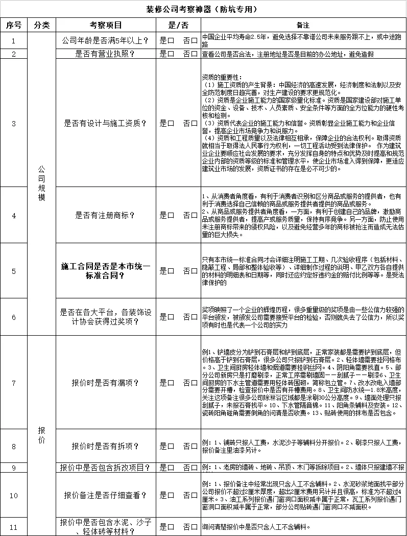 八、如何选装修施工方 不靠谱的施工方挺多的,比你想象中多。最重要是比三家,哪怕熟人介绍,也要走完比较流程。 装修公司常见的7大坑: 收钱跑路 报价中漏掉水电费用 报价中故意增项 施工质量差 交付慢 忽视施工安全 材料偷梁换柱 记住不要轻信口头承诺,一切约定白纸黑字落到文件上,水电等费用记得签订对应补充条款,装修材料的品牌、型号、价格也都在合同或报价中写清楚。 像土巴兔平台先装修后付款的模式,以及陪签、质检等保障服务,相对多了一重保障。 结合常见的坑点,整理了一份《装修公司考察标准》,文末自取