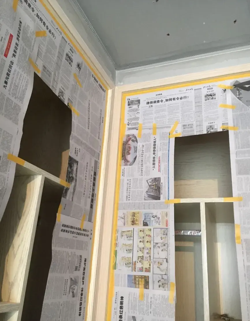 五)油工(1-2周) 大概1~2周的时间,主要是石膏找平、刮腻子、刷乳胶漆3个工序,每道工序自然晾干后才做下一道。 1、保护工作 不需要做油漆的柜体和家具要做好成品保护,之后再开展油漆施工,别弄脏家具。