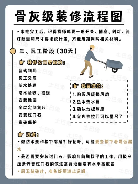 7、初次测量橱柜尺寸(1天) ①厨房水电图是由橱柜公司提供的,拆改完成前须拿到厨房水电图; ②浴室柜、淋浴房等定制类测量可以预约上门 8、预定厨卫设备 (半天) 确认厨卫设备的大小,因为要确认插座大体的数量,位置,高度等。 9、清理垃圾(1天) 拆除的垃圾清运费要跟商家协商好,一般装修公司说的免费清运垃圾一般只是运到物业指定的地点,不包括垃圾外运,垃圾外运一般是物业负责,老房子则是装修公司来处理外运。 留意: 与装修公司明确,是做完之后统一 一次清理,还是每天需要清理。 外运的话,深圳一车大概是500块,北京一车800-1000块,每天外运一次也是一笔不小的费用。 垃圾清运是常见增项漏项,要提前约定好清运费、清运地点等。 怕装修公司偷项漏项,用下方报价神器,3秒算出你家房子最新装修报价,列出五大施工项目所需材料和人工费用清单,方便对比报价,加微还可以免费领取装修全流程资料包和超全避坑指南: