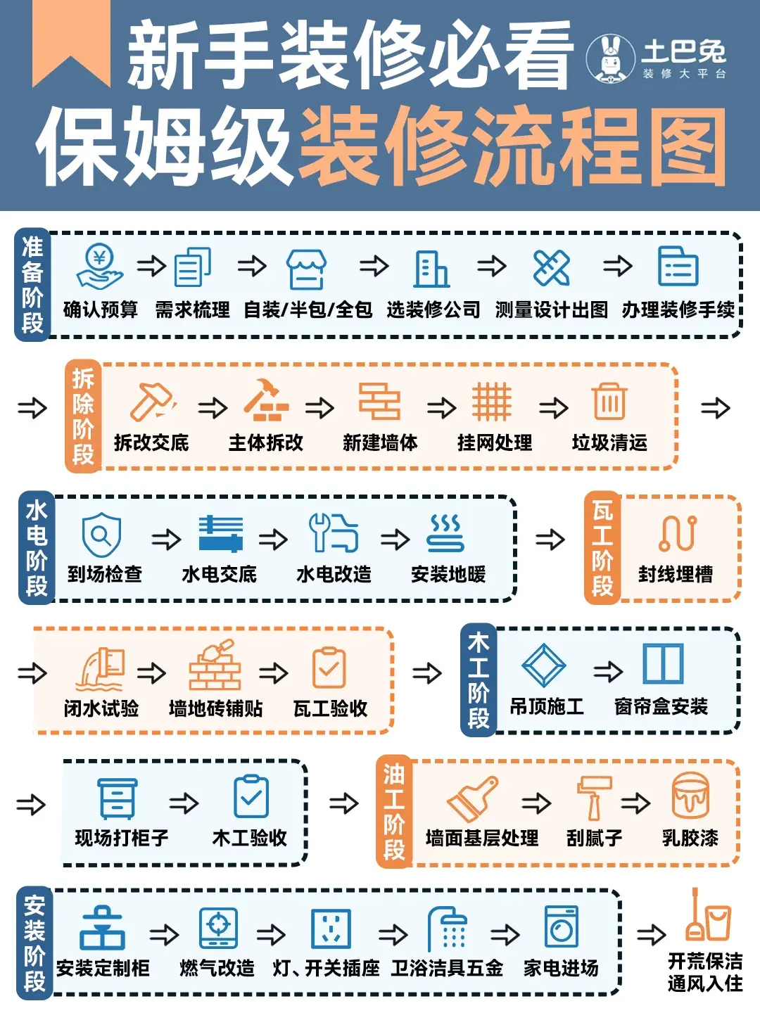 1、办理装修手续 如果选择自装,业主需要准备: 房产证,整本正页都要拍 业主身份证正反面 原始户型图 墙体改动方案(可以找设计师提供) 装修施工方案及图纸复印件 施工人员照片、身份证复印件 装修公司资质 装修押金(各个小区收取的不同,最少也在2000元,一般装修完工验收后会退给业主) 如果选择装修公司,则可由公司待办,业主只需准备: 业主身份证正反面 装修押金(各个小区收取的不同,最少也在2000元,一般装修完工验收后会退给业主) 2、装修前需要确定的材料 重点留意下,装修没开工就预定: 新风系统 中央空调/风管机 窗户 橱柜 木门 淋浴房 衣帽间 因为新风系统、中央空调拆除后就开始安装了,橱柜、木门、窗户定制生产周期长需要40多头,淋浴房和衣帽间需要 20 天多天。 十一、装修硬装施工顺序 建议先收藏下,等装修施工时对照看。 一)拆除和改建(总体需要3~5天) 新房拆除施工会少一些,但会涉及到新建墙等,二手房拆除、改建施工会比较多。