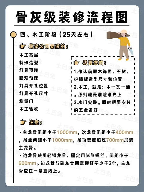四)木工(1-2周) 1、吊顶施工(2-3天) 按照一般木工顺序,进行的第一项木工施工是吊顶龙骨的架设,然后封上石膏板。