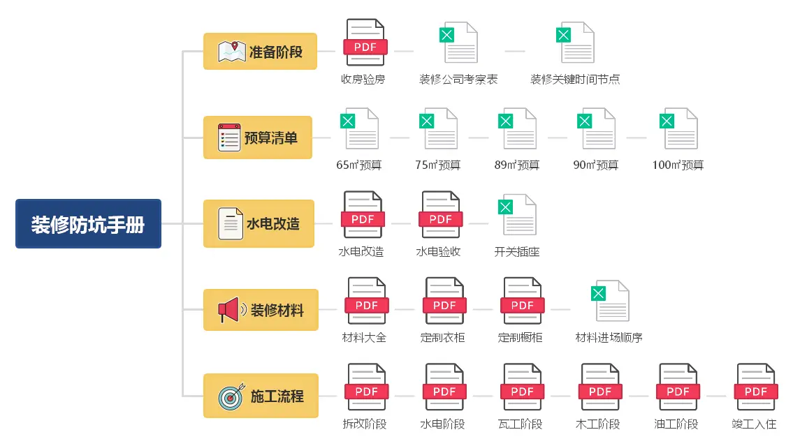 文章里提到的文件比较多( 《收房清单表》、《毛坯房验房表》、《精装房验房表》、《装修设计需求清单》、《硬装施工报价参考表》、《装修完成的业主预算控制表》、《装修公司考察标准》) ,以及一些其他的装修避坑资料!