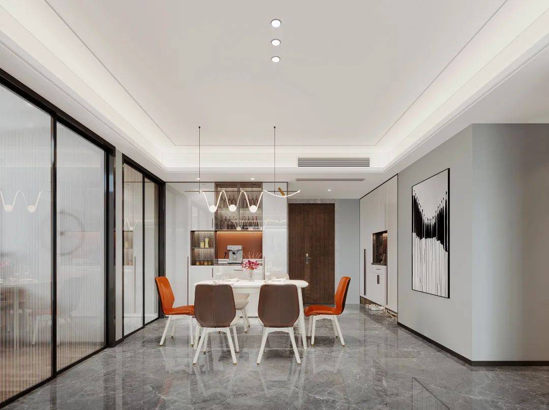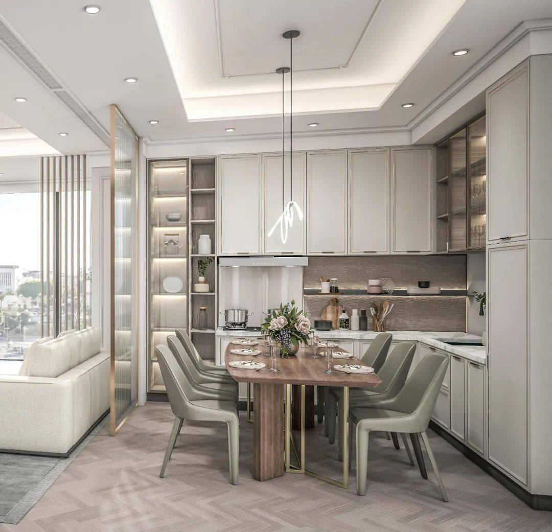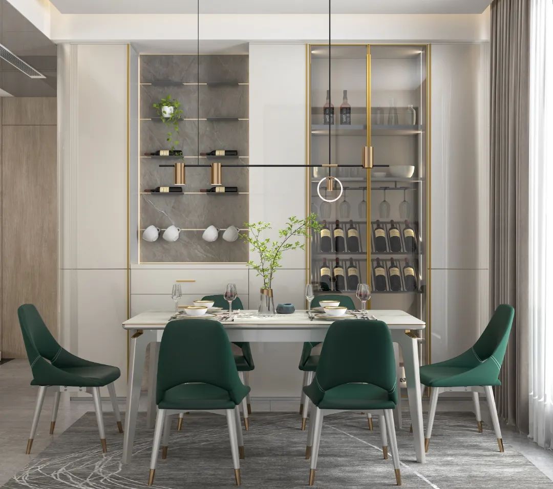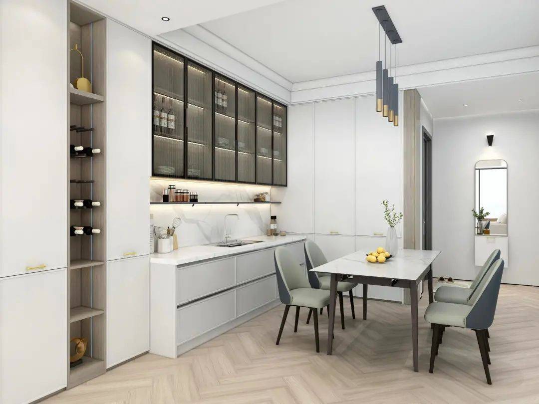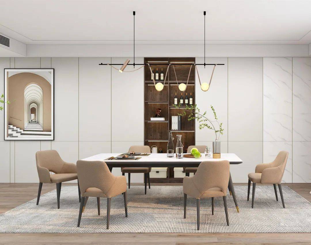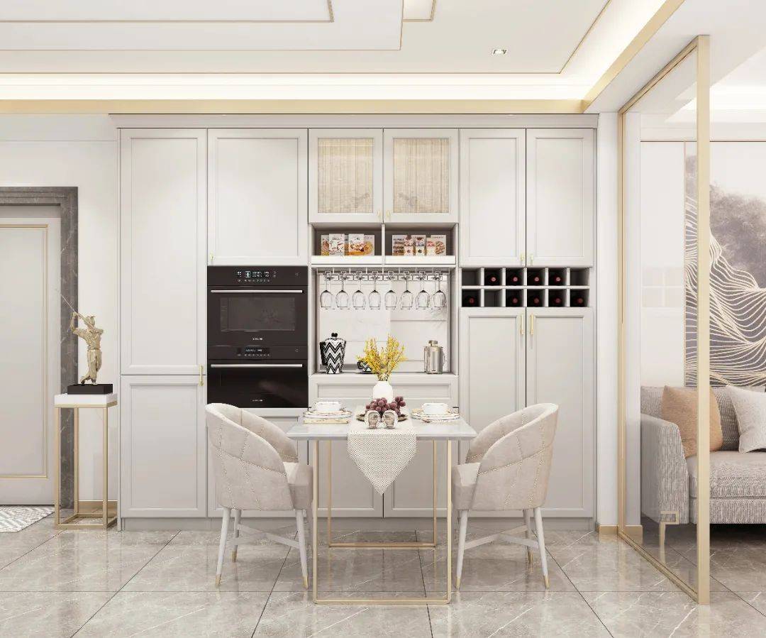 轻奢风 如果要选一个高级精致的代名词,那轻奢风一定榜上有名。轻奢风家装设计中,经常使用金属元素作为小范围点缀,一眼望过去并不华贵,但细节处又透露着浪漫与精致,很多白领都喜欢这种风格。 在轻奢风餐厅中,浅色的柜体、金边勾勒的柜门、玻璃元素的穿插使用、颇具设计感的餐桌椅再加上精致的吊灯,就能营造出情调十足的用餐氛围。