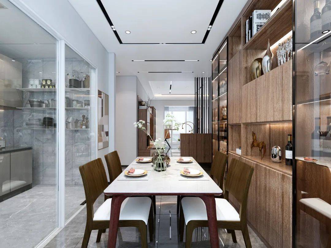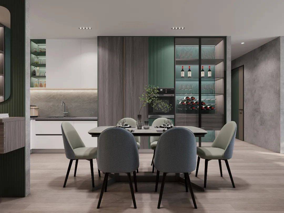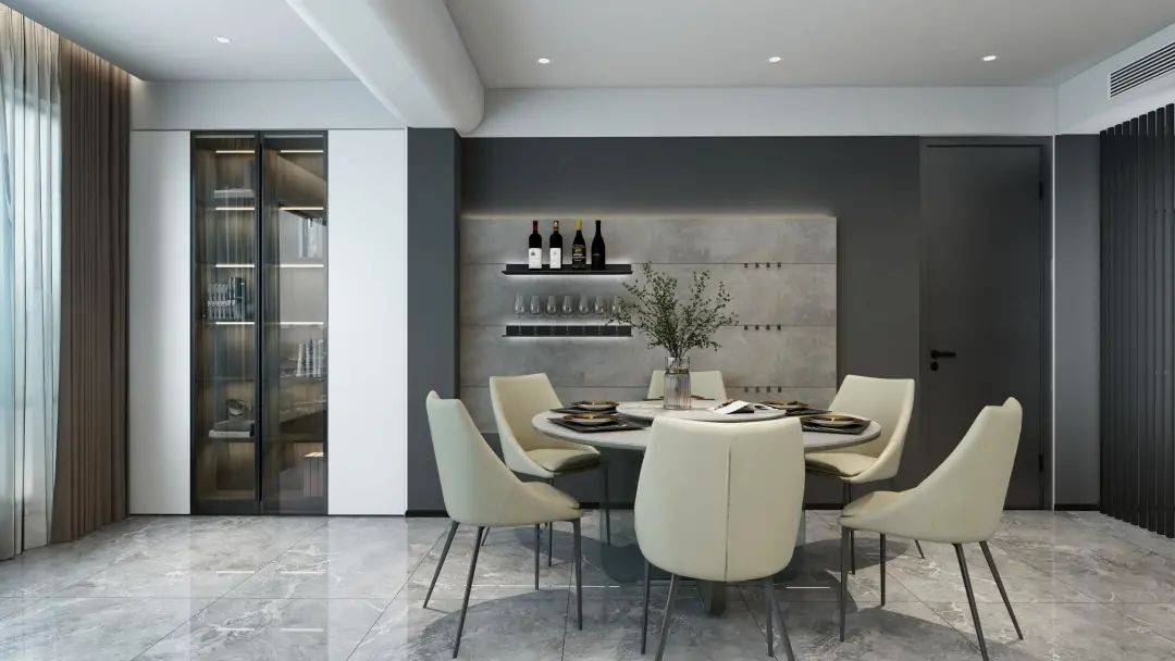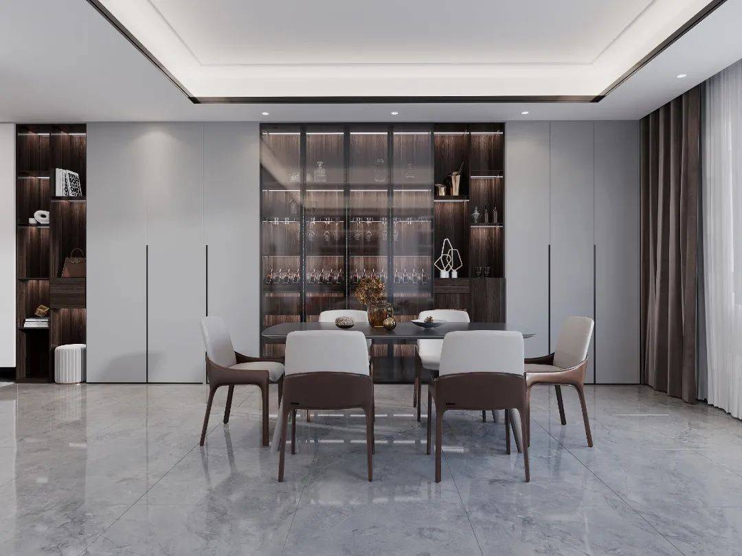 意式风 意式风格大多都以黑白灰为主基调,简单的中性色却能打造出一种不言自明的高级格调感,为避免空间过于压抑,也常辅以深棕木色或其他深原木色进行调和,再用上栅格背板、玻璃等元素,就能让平面空间更显立体。意式的餐厅通常没有过多繁杂的设计,简单的配色加上一门到顶的无把手定制柜,配以细腿的餐桌椅,就能打造出意式独有的质感,让人用餐也自带精英范儿。