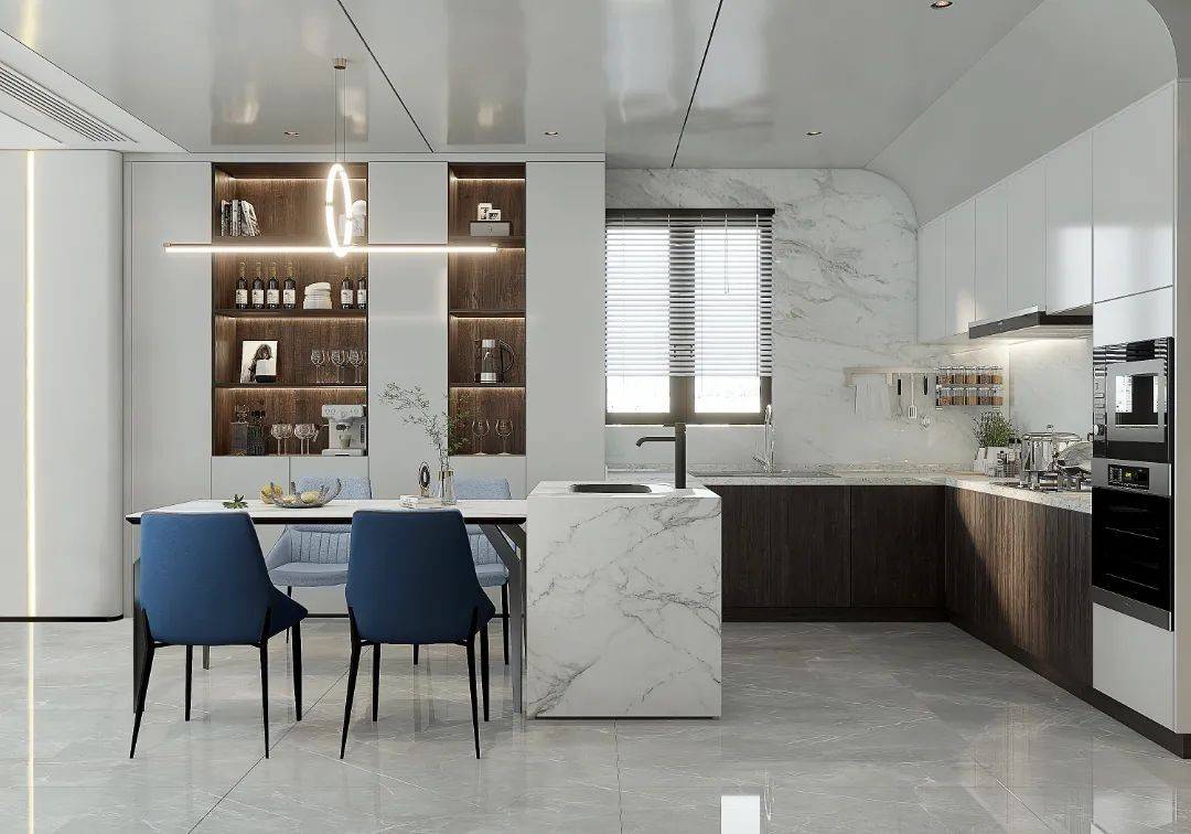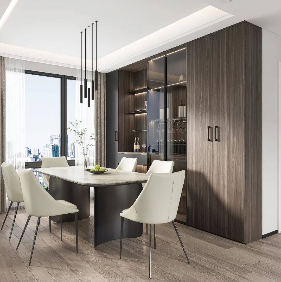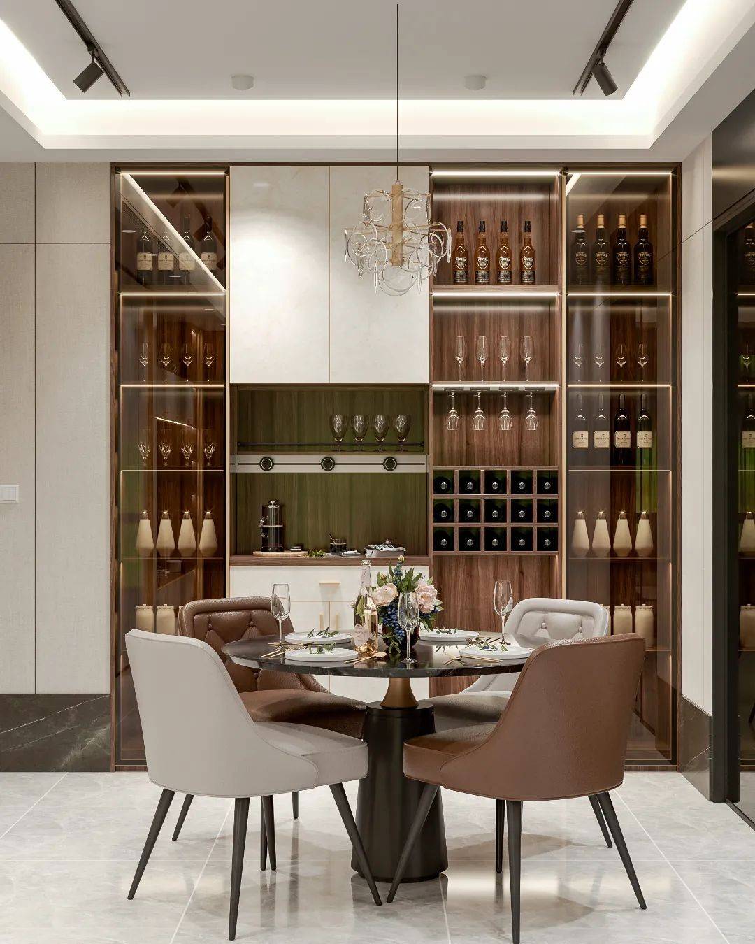 意式风 意式风格大多都以黑白灰为主基调,简单的中性色却能打造出一种不言自明的高级格调感,为避免空间过于压抑,也常辅以深棕木色或其他深原木色进行调和,再用上栅格背板、玻璃等元素,就能让平面空间更显立体。意式的餐厅通常没有过多繁杂的设计,简单的配色加上一门到顶的无把手定制柜,配以细腿的餐桌椅,就能打造出意式独有的质感,让人用餐也自带精英范儿。