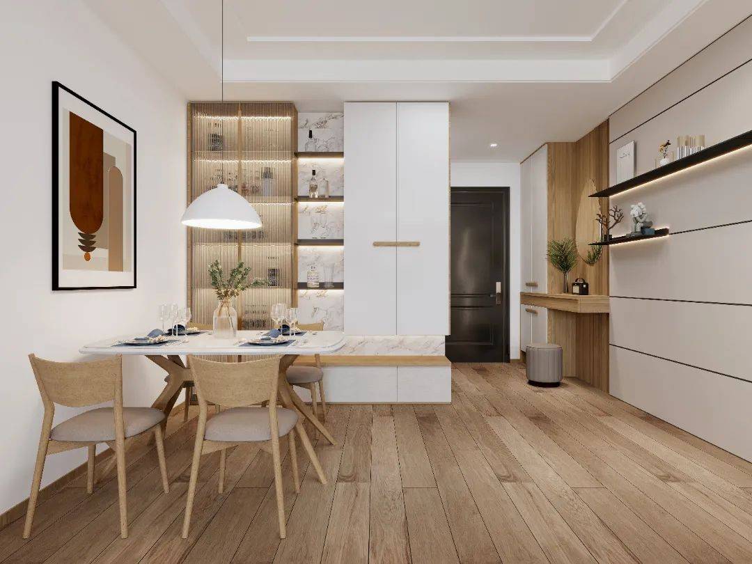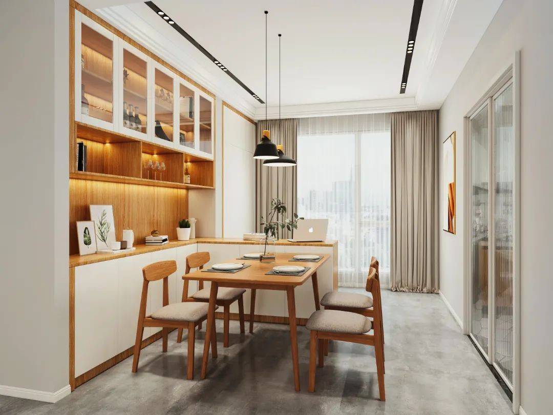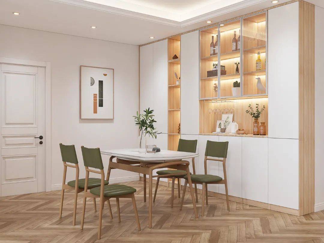 北欧风 北欧风代表着一种舒适自在的生活态度,设计上也常从实用主义出发,很受现在年轻人的欢迎。北欧风的设计以原木+浅色系的搭配为主,简单清爽。在这样的房子里,时不时叫上三五好友来做客玩乐,再吃上一顿丰盛的午餐或晚餐,就是忙碌生活的惬意时刻。 北欧风常用于中小户型,餐厅空间往往不会太大,餐边柜大多以白色为主,原木色做开放格点缀,给人一种温馨自然的治愈感,餐桌椅几乎也都是原木风格,在这儿用餐,仿佛身临北欧的自然大森林,惬意自在。