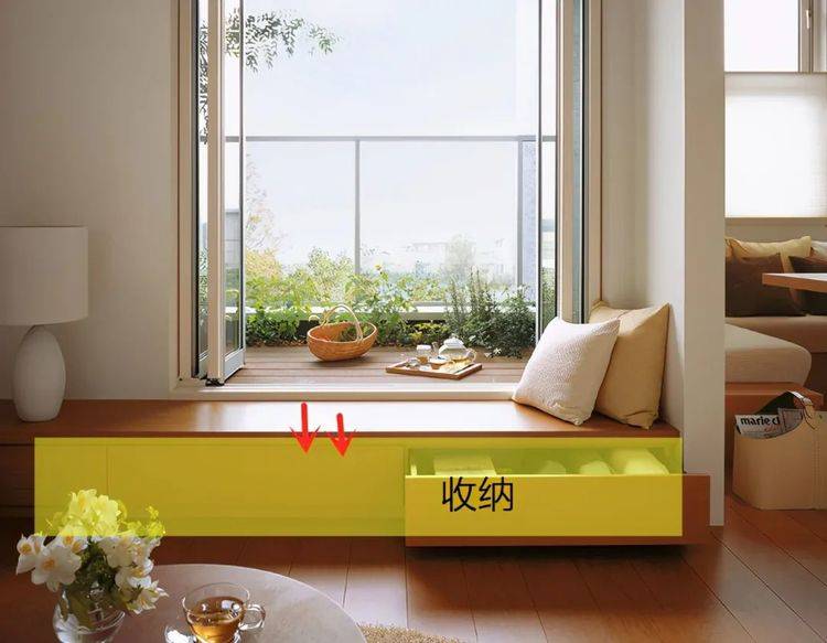 就算现在天冷了,关上阳台门,坐在地台上照样能看看书、喝喝茶、听听音乐,你说,这是不是也是相当的享受。 功能三:收纳置物两不误 地台挑空设计,室内一侧装上抽屉,作为收纳用,方便实在。不夸张的多出个1㎡的储物空间绝对是可以的。再看看台面,日常用品的摆放也是相当方便的。