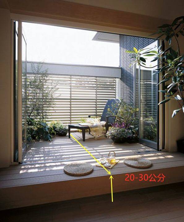 阳台连入室内,抬高25~30cm做地台,不会像下沉式那样,需要破坏到地面。这样的设计,楼下的邻居也不会有意见,做上后自己舒适了,物业也不会找上门。为何要将阳台连入室内的,主要原因就是要实现多功能为一体。 功能一:留空种花种草,铺上甲板变身休闲区 几万一平买来的阳台,只用于晾晒的话,稍显浪费。有人想在这边种花种草、有人想着这边喝茶聊天,抬高25cm后就可以实现了。