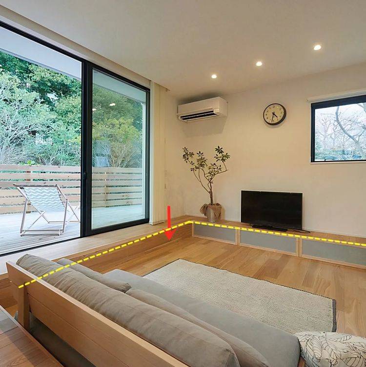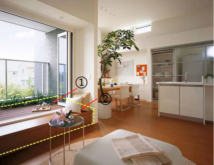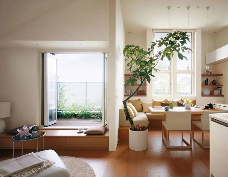 靠近窗户旁边可以隔起来种花种草,靠近室内一边,铺上甲板立马变身休闲区。一个阳台实现,休闲、晾晒、种花种草三大功能,大大提升其利用价值。 注:种花种草,排水以及防水问题,务必做好。 功能二:室内多了个地台,客厅有了下沉式效果 阳台功能性提升了,室内也多了个地台。不用做下沉式设计,家里的其它室内空间也有了下沉式的效果,单单这个就愣是让邻居看了眼红了。