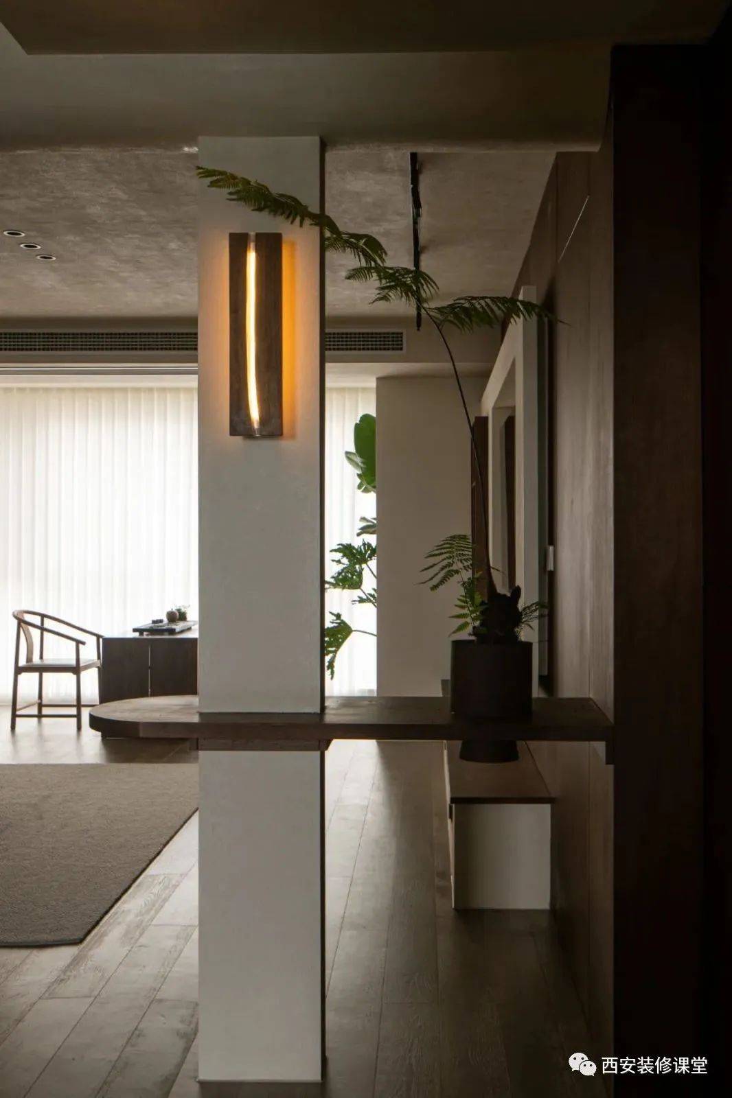 原木玄关柜设计,采取不同格子布局,从而达到分门别类的收纳效果。端景台+窗洞的设计,给人留下很深的印象,雅致而宁静。 13