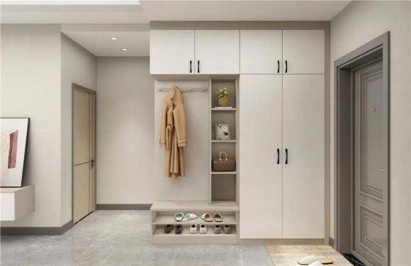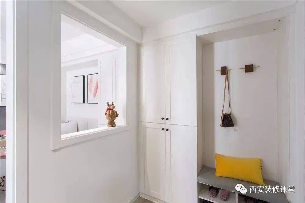 一整面做鞋柜,另一边则做换鞋凳,如果感觉鞋柜不够用,换鞋凳上方可以做吊柜搭配收纳柜来补充收纳空间。 7
