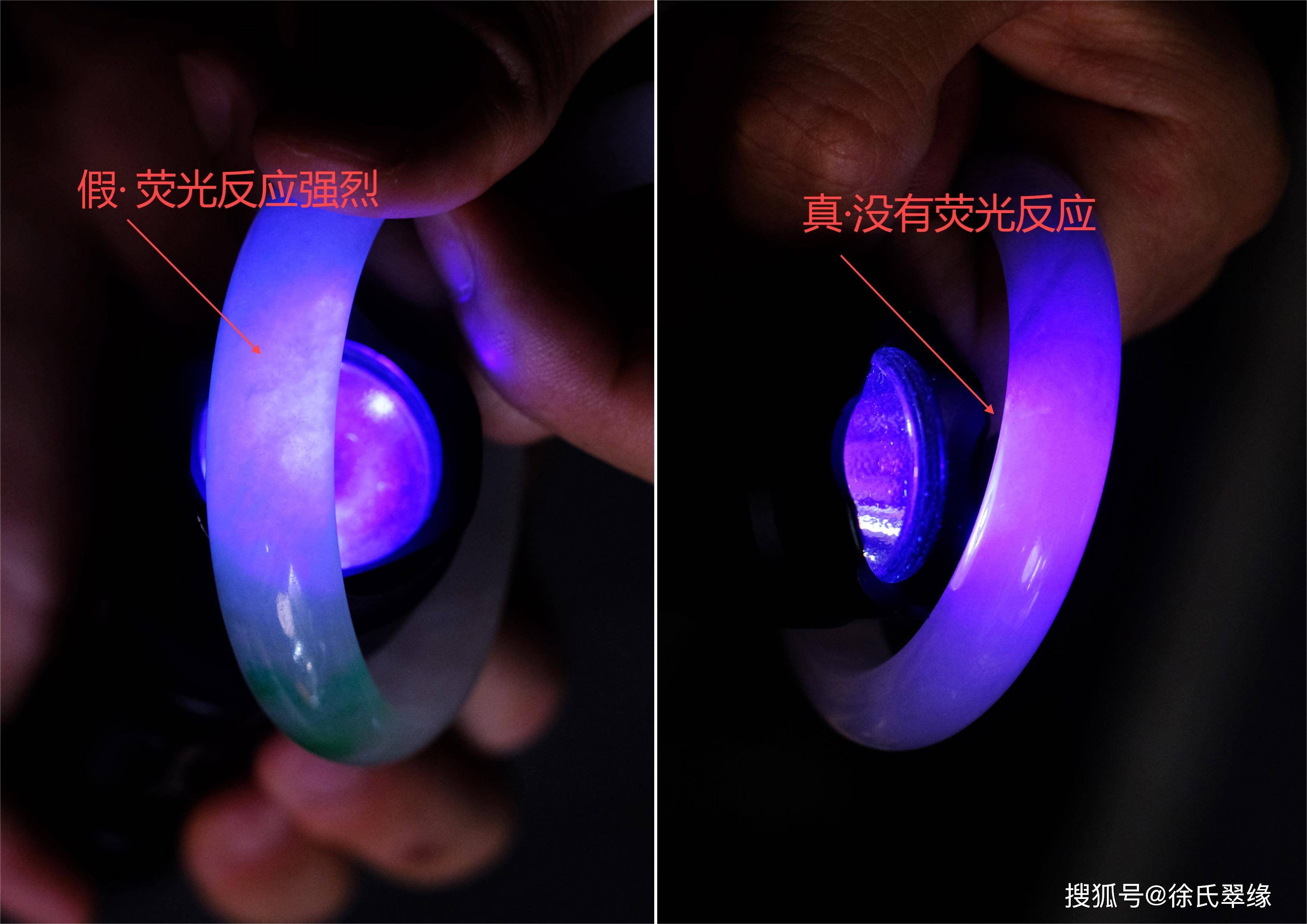 5.紫光灯 在紫光灯下,天然翡翠通常没有荧光反应,但在凹槽局部有弱荧光反应,是残留抛光粉和保护蜡造成的;处理过的翡翠有明显的蓝白色荧光反应。