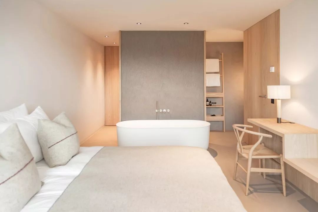 酒店中的独立设计 open-plan in luxury hotels 到了现代,精品酒店设计者将浴室进行「拆解」,分离出浴缸放在卧室里,就形成了开放式浴室的早期雏形。 这样的客房更能让舟车劳顿的商旅得到彻底放松。