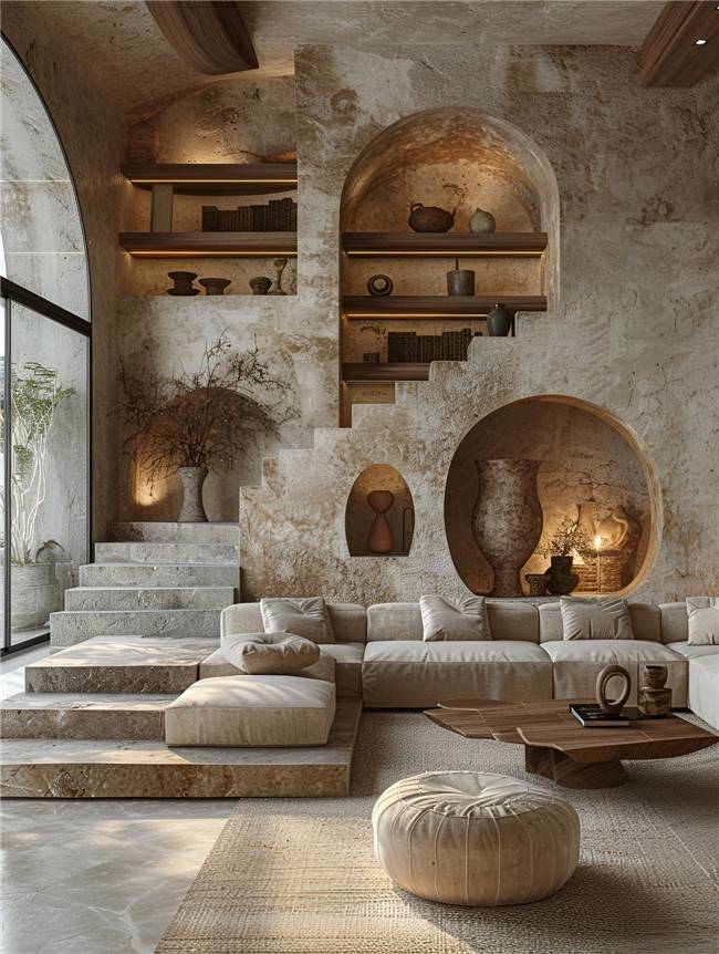 错落有致的楼梯、墙面 凸显了空间的层次感、厚重感 壁龛里的复古花瓶与摆件 最大限度还原其石质本色 阳光、灯光交融 吟诵出一首光明交响“史诗” 同色系的沙发、蒲团,麻质地毯与木质茶几 让整间居室更加和谐、统一