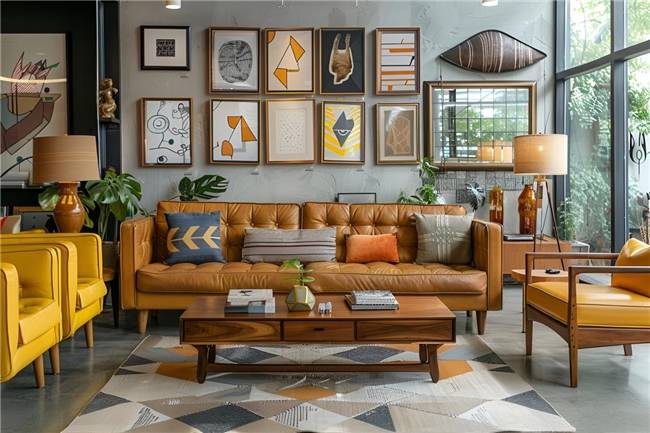 大面积挂抽象画和手工制品增添了艺术氛围感 居中的中古三人位真皮沙发不仅仅是一张坐具 连同实木茶几彰显出一种生活态度 并排的两张甲壳虫单椅与休闲单人椅 因其明亮的跳色 让人仿佛从中古世纪穿越回现代都市 随处可见的绿植带来健康“森”呼吸