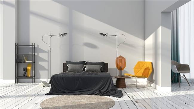 室外光线的投射与两盏北欧ins风落地灯 角落的铁质置物架形成光影的交织 平添一份独属于傍晚的余晖之美 一张铺满法兰绒床品的双人床倾诉着过往甜蜜的闲暇时光 茶色灯罩的后现代简约床头灯 仿佛在静静地聆听着往昔的岁月 橘黄色的轻奢拼接休闲椅更贴合艺术审美 而邻屋的单人椅正期待着主人的归来