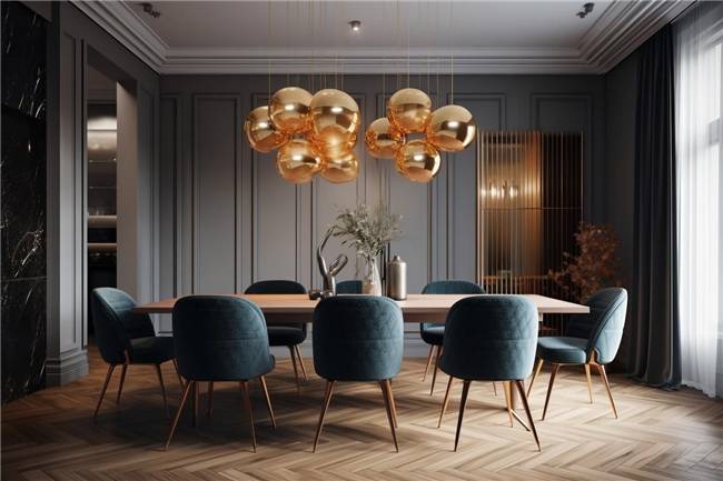 金色的熔岩吊灯以浪漫的氛围灯光找寻到真实的理想生活 照亮了些许暗沉的装饰风格 为用餐带来愉悦心情 八个天鹅绒质地的餐椅围绕着实木餐桌 就像主人一家的长幼次序 餐桌上的艺术摆件与插花 将奢华与现代艺术感拉满