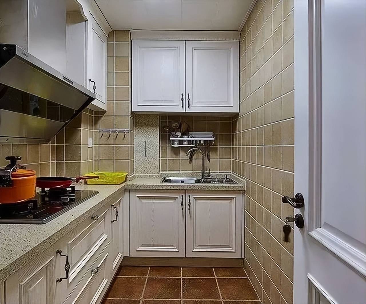 厨房装修简洁雅致,大理石台面与木质橱柜和谐共生,每日爱心便当诞生于此,爱意满满,厨房更显温馨甜蜜。