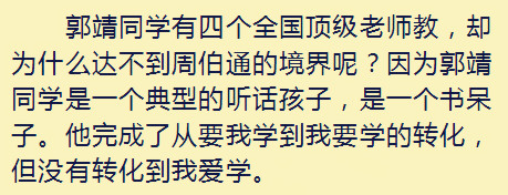 还有人将杨康和郭靖对比探讨教育问题,讲父母老师的影响看着都还挺在理,可一讲到郭大侠的智商就文风突变了,小编摘几段给大家看看: