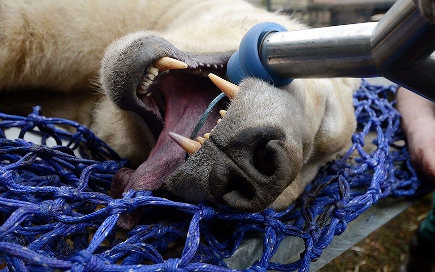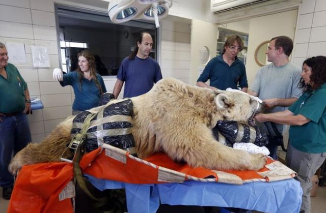 一只530公斤重的北极熊正在手术台上,牙医们正在用X光扫描它的犬齿。这个角度看北极熊君的鼻孔好大……