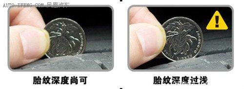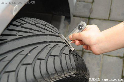 胎面花纹的厚度一定要大于1.6毫米,如果你经常驾车行驶在摩擦力低的湿滑路面上,最好能保证胎面花纹厚度是上述数值的两倍。你可以学习专业人士,购买一个计量器来测量胎面花纹的厚度;然而老驾驶员常使用一种广为流传的办法来大致估计胎面花纹厚度,那就是拿出一枚一元硬币,顺着国徽顶端方向插入胎面沟壑中,因为硬币边缘到国徽顶端的距离在1到2毫米之间,所以如果这时还可以看到整个国徽标志,说明胎面花纹厚度已经不足。