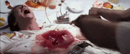 03《异形》 破体而出的异形 又一童年阴影。 异形从男人的胸口破膛而出。 场面血腥无比! (白屏护体!左滑看图)